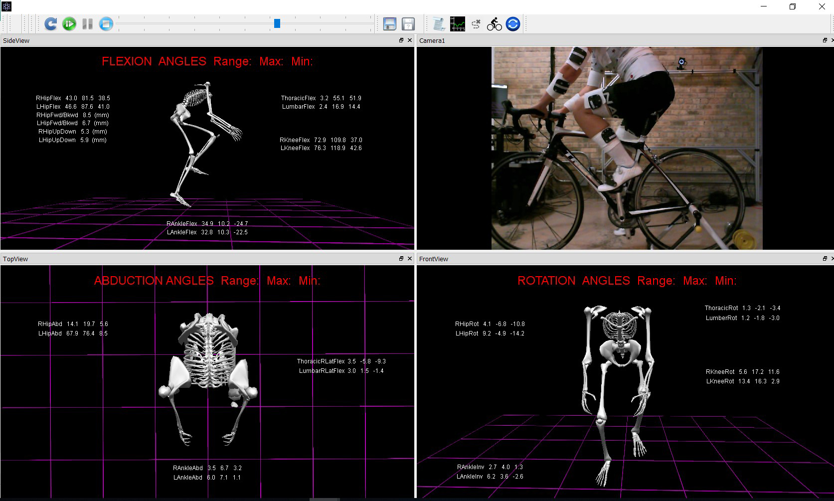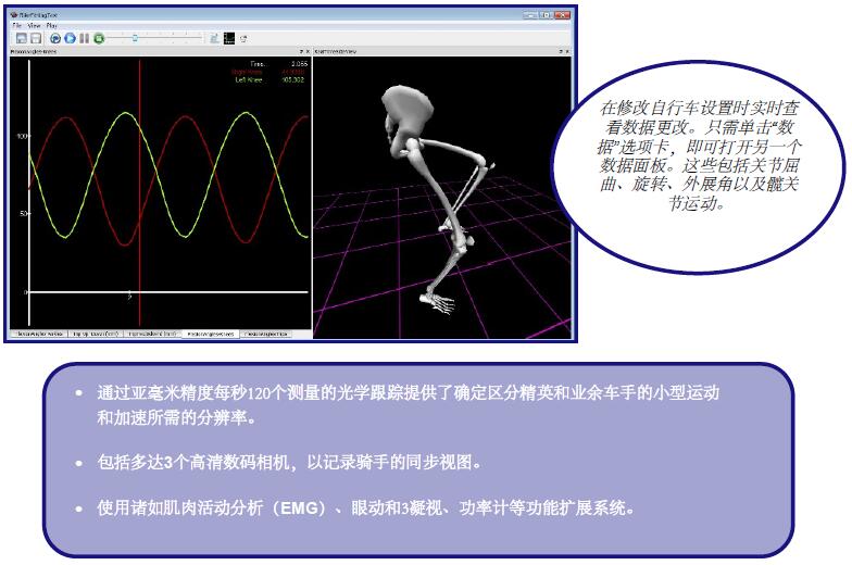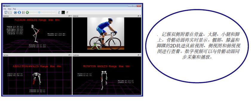 從預(yù)先選擇的正面、側(cè)面和俯視角度查看髖關(guān)節(jié)、膝關(guān)節(jié)和踝關(guān)節(jié)的 2D 和 3D 軌跡,或“繞”動(dòng)畫(huà)以從您的手選視角查看。 同步數(shù)字視頻的捕獲使騎手可以看到與他們的動(dòng)作同步的 3D 動(dòng)畫(huà)。
