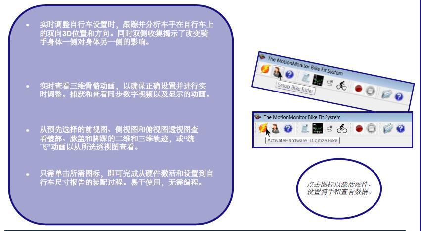 該系統(tǒng) 使在自行車合身期間實(shí)時(shí)采集復(fù)雜的、研究質(zhì)量的數(shù)據(jù)變得快速而輕松。 查看沿自行車尺寸的騎手生物力學(xué),以監(jiān)控合身度的相關(guān)性。 與其他聲稱支持 3D 跟蹤的系統(tǒng)不同,該系統(tǒng) Bike Fit 系統(tǒng)可跟蹤 6 個(gè)自由度 (6DoF),其中包括 3D 位置和 3D 方向。 您次可以在整個(gè)踏板行程中跟蹤雙側(cè)髖關(guān)節(jié)、膝關(guān)節(jié)和踝關(guān)節(jié)的旋轉(zhuǎn)……you化騎手表現(xiàn)的貼合的關(guān)鍵數(shù)據(jù)。 包括多達(dá) 3 個(gè)高清數(shù)碼相機(jī)來(lái)記錄騎手的同步視圖。 后,通過(guò)肌肉活動(dòng) (EMG) 分析、力數(shù)據(jù)和虛擬現(xiàn)實(shí)等功能擴(kuò)展系統(tǒng)。