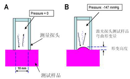 組織柔軟度測(cè)量?jī)x的測(cè)量原理是通過在被測(cè)皮膚表面形成負(fù)壓,使皮膚吸入測(cè)試探頭,此探頭有一對(duì)收發(fā)光管(激光收發(fā)裝置),發(fā)光管的激光功率恒定,由于吸入皮膚的深度不同,接收管感應(yīng)到的激光強(qiáng)度也不同,從而可以得到深度一氣壓差的曲線,通過分析此曲線就可以得到皮膚的彈性和粘彈性值。