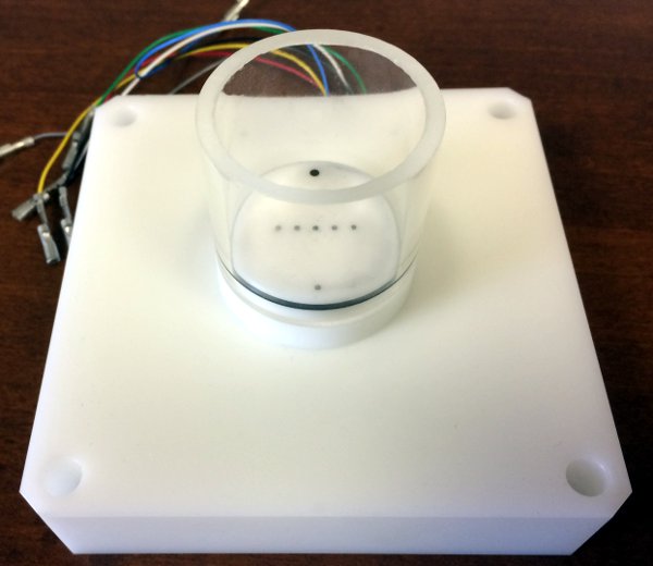臺式測量關(guān)節(jié)軟骨的壓縮誘導(dǎo)的流動電位。在溫和壓縮軟骨表面期間使用壓頭測量這些電信號(參見下圖)。te的壓頭設(shè)計包括覆蓋有37個微電極陣列的球形表面。