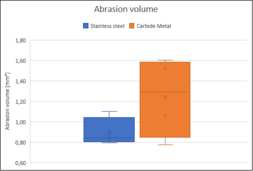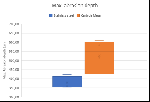 在Voco Structur 2 SC扁平試樣上,使用四個(gè)不銹鋼圓錐體和四個(gè)硬質(zhì)合金圓錐體作為拮抗劑。在蒸餾水中,以50N進(jìn)行240,000個(gè)在咀嚼模擬循環(huán)后(相當(dāng)于體外約1年),測(cè)量硬度,磨損量以及大深度。