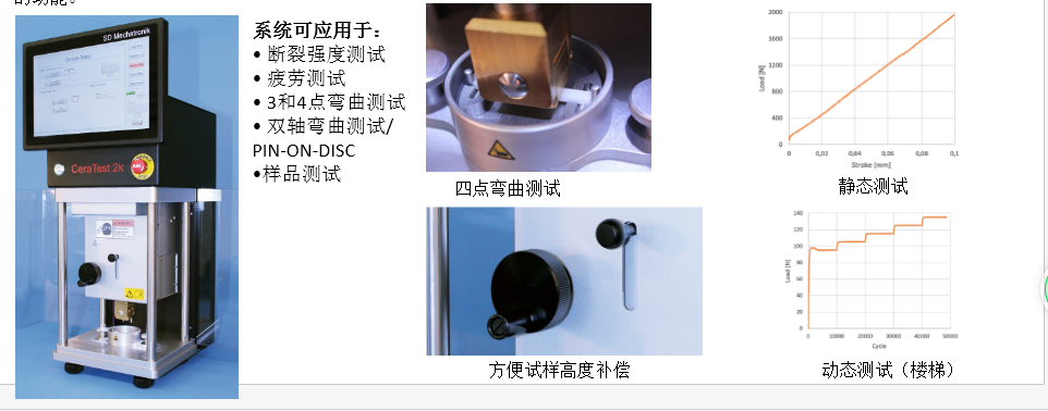由SD Mechatronik推出的新一代CeraTest 2k可在單個(gè)設(shè)備中對(duì)氧化鋯、陶瓷材料和植入物進(jìn)行靜態(tài)和動(dòng)態(tài)測(cè)試,集靜態(tài)斷裂載荷測(cè)試和在動(dòng)態(tài)操作模式下擺動(dòng)測(cè)試兩大關(guān)鍵功能于一身,為用戶提供快速,可重復(fù)且自主的解決方案。靜態(tài)測(cè)試中大載荷可達(dá)2kN。動(dòng)態(tài)測(cè)試中用戶可自定義正弦力曲線的大和小限值。 載荷頻率范圍為1Hz至15Hz。其應(yīng)用軟件已包括長(zhǎng)時(shí)和階梯測(cè)試的功能。