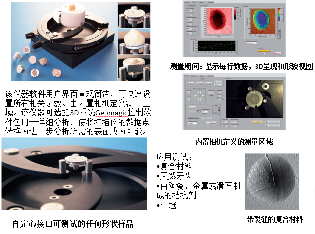 是一款體積小、精度高、易使用、通用性強(qiáng)的口腔材料表面測(cè)量?jī)x器,只需插入樣品,定義測(cè)量區(qū)域,wu需其它額外工作便可開始掃描!該儀器著重于表面分析和綜合數(shù)據(jù)導(dǎo)出功能。垂直傳感器分辨率可高達(dá)0.8微米,因此,諸如裂縫和運(yùn)動(dòng)痕跡等細(xì)微結(jié)構(gòu)都可清晰分辨。
