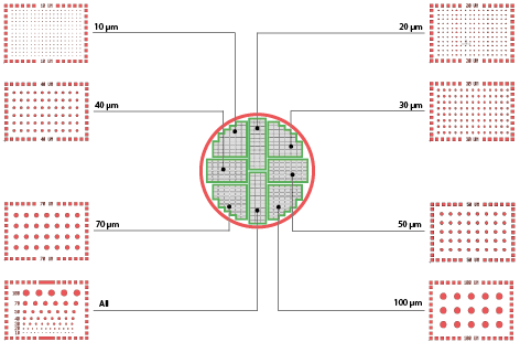 每個蓋玻片上有八個區(qū)域,其特征是寬度(凹槽)或直徑(圓孔)不同:從10μm到100μm。