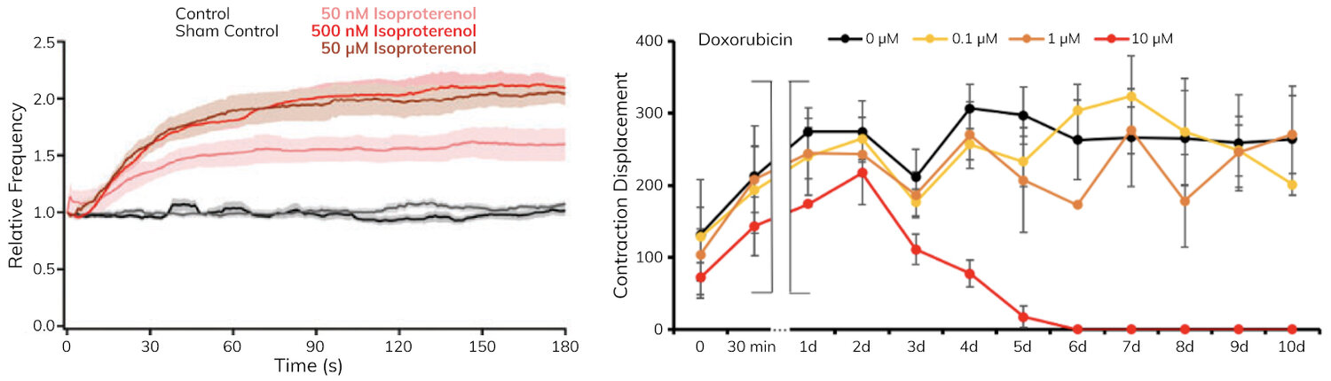 磁檢測方法可以測量急性(分鐘)和慢性(天)藥物反應(yīng)。 諸如異丙腎上腺素(左)之類的藥物可以在數(shù)秒至數(shù)分鐘的時(shí)間內(nèi)進(jìn)行測量,并具有足夠的靈敏度來測量類似劑量反應(yīng)的行為。 另外,可以在幾天內(nèi)進(jìn)行長期的慢性實(shí)驗(yàn),例如阿霉素(右)。