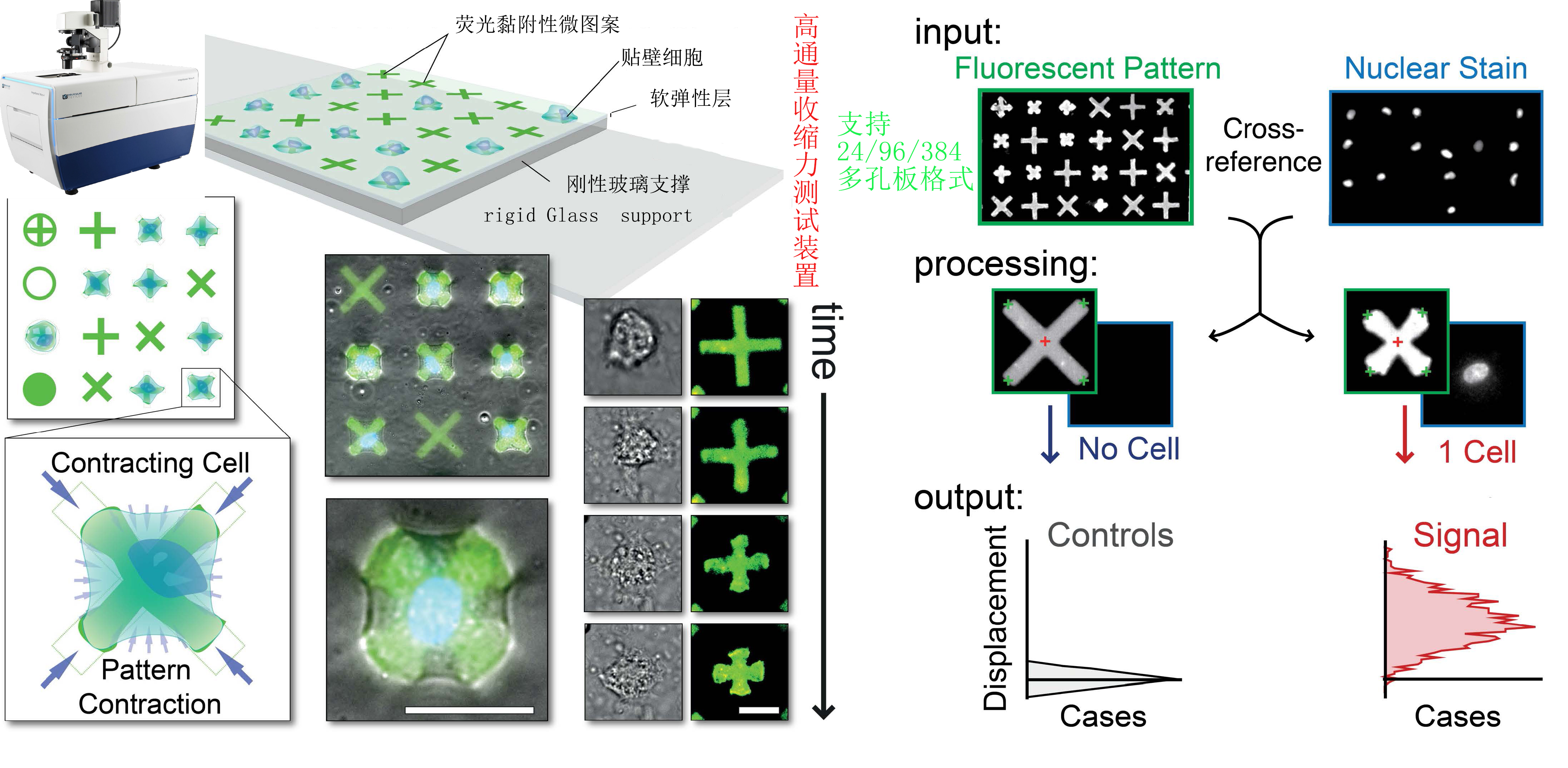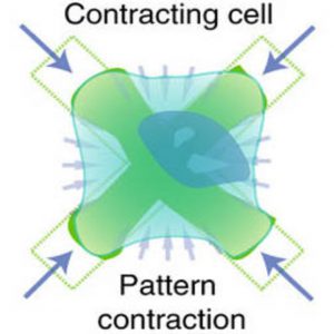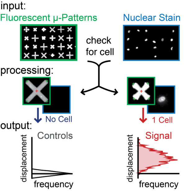 在具有可控剛度的彈性薄膜中嵌入用戶設計的粘合劑和熒光微圖案,形成非常密集但均勻的陣列(> 120微米/每平方毫米)。100000個患者來源的單細胞(精度地從疾病起源的人體組織中獲得)du立地定位并粘附在微圖案上(每個微圖案一個細胞),它們對該微圖案施加牽引力并明顯改變其形狀,從而能夠在ji高的吞吐量下對細胞收縮性進行直觀的基于圖像的評估。