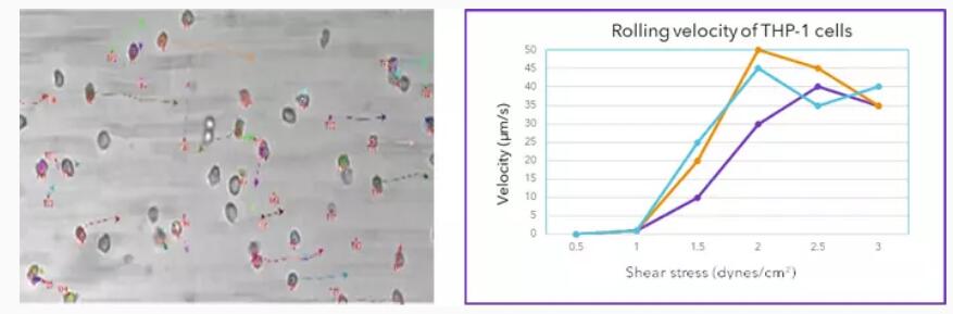 使用 Image Pro Premier 對 Vena8 Fluoro+ 生物芯片的 E-選擇素包被微毛細(xì)血管上的 THP-1 細(xì)胞進(jìn)行滾動速度分析