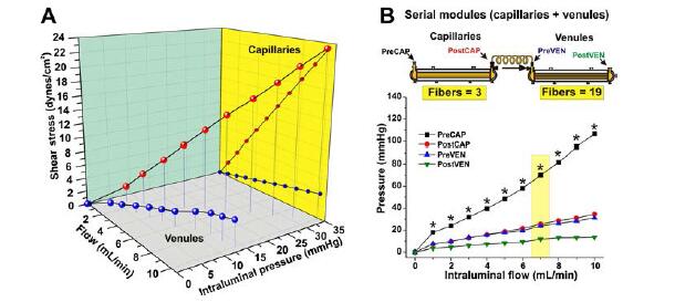(圖1) 圖 2 DIV 毛細(xì)管-小靜脈系統(tǒng)的流變特性。 圖 A:毛細(xì)血管和小靜脈段在灌注方面的血流動(dòng)力學(xué)曲線。 面板 B:請注意,毛細(xì)管腔和小靜脈腔之間存在模塊間連接器并沒有改變流動(dòng)的流變曲線。 星號(hào)“*”表示毛細(xì)血管和小靜脈之間透壁壓的統(tǒng)計(jì)學(xué)顯著差異(n=4;p<0.05)。