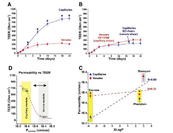 圖 3 體外毛細(xì)血管和小靜脈血管床的并排比較。面板 A:注意與小靜脈(低 TEER)相比,毛細(xì)血管系統(tǒng)如何允許形成非常嚴(yán)格的血管床(高 TEER)。 (面板 B)。另請注意,在小靜脈水平的剪切應(yīng)力下建立的毛細(xì)血管段和暴露于毛細(xì)血管剪切應(yīng)力水平的 enules 模塊形成了相當(dāng)?shù)偷膰?yán)格屏障,這表明腔外星形膠質(zhì)細(xì)胞和高剪切應(yīng)力水平對于發(fā)展緊密的血管床是必要的(圖 C)TEER毛細(xì)血管和小靜脈模塊中的蔗糖滲透性相關(guān)性。 sigmoid 曲線象征著 TEER 和我們之前確定的滲透率之間的里想相關(guān)性 [55]。注意毛細(xì)血管(滲透性較低)和小靜脈(滲透性zui強(qiáng))之間的 ≈ 2 個(gè)數(shù)量級(jí)的差異。毛細(xì)管模塊中形成的更嚴(yán)格的血管床可以根據(jù)辛醇-水分配系數(shù) (XlogP) 區(qū)分藥物滲透性,其選擇性明顯高于小靜脈(圖 D)。星號(hào)“*”表示有統(tǒng)計(jì)學(xué)意義的差異(n=4;p<0.05)。