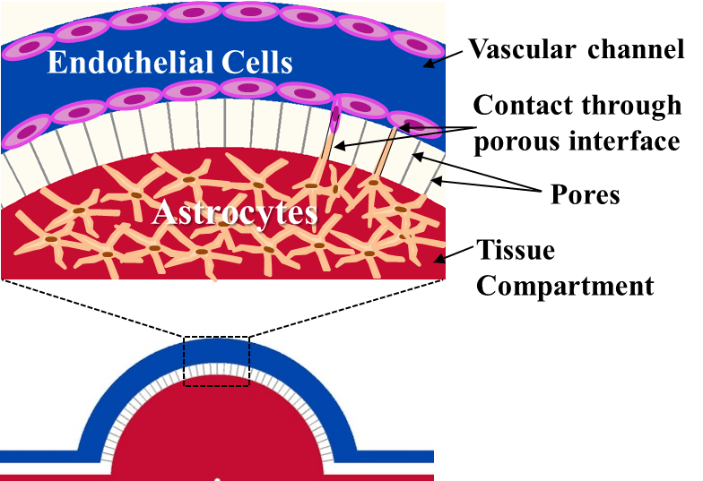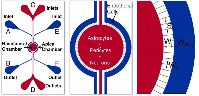 Schematic of the BBB Model. Apical chamber (outer channels) are for culture of vascular (endothelial cells) while basolateral chamber (central chamber) are for culture of brain tissue cells (astrocytes, pericytes, neurons). Porous architecture enables communication between the vascular and tissue cells.