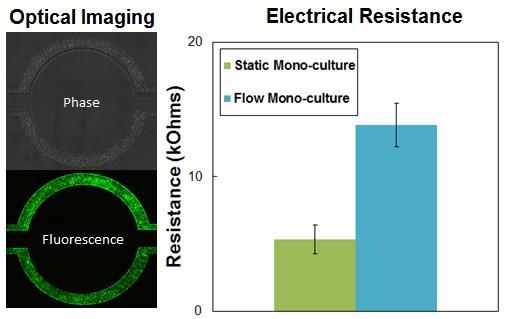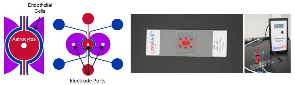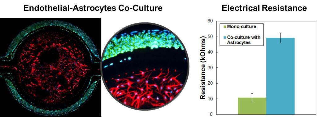 Endothelial cells are cultured under flow in the vascular channel, and the tissue chamber is cultured with primary brain cells, such as astrocytes. Increases in Ohmic resistance across the barrier, measured with the Cell Impedance Analyzer, are associated with tight junction formation across the BBB. Endothelial cells co-cultured with astrocytes form significantly tighter cell junctions compared to mono-cultured endothelial cells.