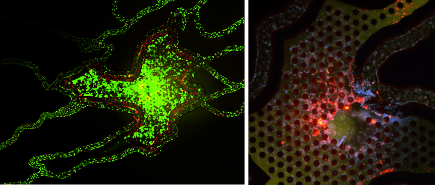 The tumor-endothelium co-culture mimics the tumor microenvironment and in this example captures degradation of the extracellular matrices by the aggressive tumor toward the vasculature channels, a precursor to extravasion and metastasis.