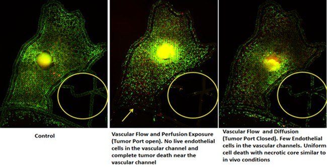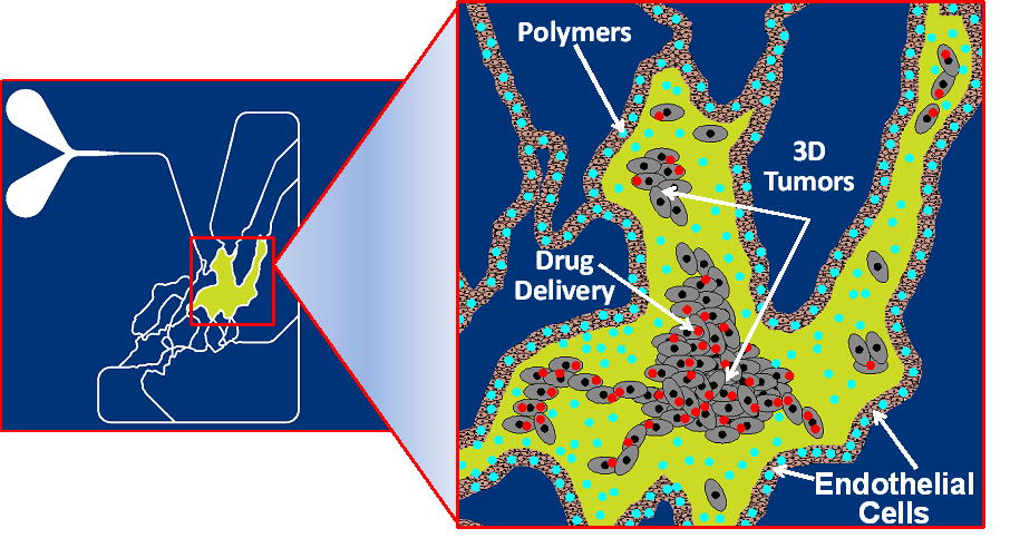 Drugs or delivery vehicles (nanoparticles, polymers, liposomes, etc.) can be injected via the vascular channel or directly on the tumor under both static and physiological fluid flow conditions and their responses can be observed in real-time mimicking the in vivo conditions.