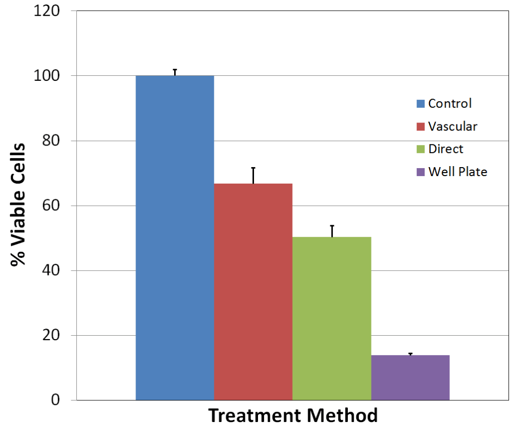 3D culture of endothelial cells and breast cancer cells were evaluated for their viability following treatment with chemotherapeutic drugs.? SynTumor model demonstrated significant differences in drug responses under static conditions compared to perfusion and diffusion based modes of interaction commonly observed in vivo.