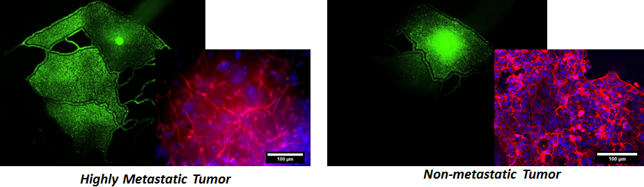 Monitor in real-time tumor cells phenotypic behavior. A metastatic tumor rapidly spread to adjacent chambers (left) while non-metastatic tumor does not (right). Inset image shows stained images highlighting elongated protrusions for metastatic tumor in contrast to localized for non-metastatic tumor. ?Use this assay to screen tumor cell populations for their metastatic potential.