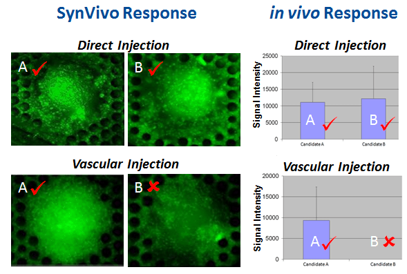 SynVivo and in vivo response show that both the nanopolymers labeled A and B transfect the core of the tumor with uniform GFP expression following direct injection. In contrast, vascular injection route in SynVivo shows uniform transfection of the tumors only for nanopolymer labeled A matching the observed results in vivo.